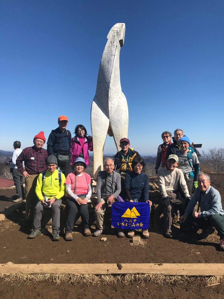 今回の南高尾山稜コースは、ヤマレコで調べると南高尾セブンサミッツとも呼ばれ、多くの投稿がある人気ルートであることがわかりました。まず、相模湖駅から大垂水峠までバスで向かいます。バス停で降りた登山客の多くは城山方面に向かうため、間違わないように案内看板を確認して、梅ノ木平方面へむけて出発!今日は快晴で無風といった良好な天候でしたが、最初のピーク大洞山までは展望はありませんでした。穏やか登りを進み、観音像のある中沢山を過ぎたあたりから津久井湖や丹沢の山並みの展望が開けます。西山広場ではなかなか立派な龍の彫刻がベンチになっていて、ここで集合写真を。梅の木平との分岐のある西山峠、三沢峠を経て榎窪山へ。このあたりから小さなアップダウンが始まります。少し疲れが出たころに草戸山に到着し、城山湖を眺めながらランチに。ゴールの高尾山口駅までも小さなアップダウンが続きますが、四辻を経由して無事に到着しました。全体的に歩きやすい登山道で、泥なども少なく冬の登山にはちょうどいいコースでした。ただ、人気コースであるためすれ違いが多々あること、落ち葉が多いことなど、ちょっとした注意が必要です。   (記:KHa)