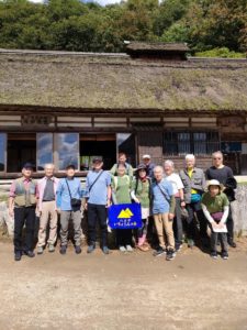 へ。趣のある道を歩き、その昔女人禁制時代に女人が籠り、お参りをした女人堂を通り薄峠へ。なだらかなアップダウン、急な下りの階段、スカイライン等変化のある道を歩く。途中でドイツからの若いカップルやスイスからの親子に会う。この二グループとは最終日まで先になり、後になりで歩くことになるとは知らなかった。かなり長い下り坂を降りて大股バス停へ、民宿の車で民宿かわらび荘へ。夕飯の後、明日の作戦会議と賑やかな団らん。その階には我々以外の宿泊客がいなくてヨカッタ。次の朝、いきなりの急登。今回の最高地点である伯母子峠へ。好天で眺望がよく、しばし休息。途中のちょっとした平地に昔の茶屋跡や屋敷跡等があり、往時の街道であったことが偲ばれる。三浦口バス停から民宿山本へ。ここはKYさんが10数年前に宿泊した所であり、KYさんのお話の通りに美味しい食事、ご主人との話、そしてKYさん達が記した帳面を発見と素晴らしい夜を過ごした。三日目、天気予報では雨。今にも降り出しそうな雲行き。全員合羽を着て歩き始めた。しかし歩くにつれ天気は回復。我々の行いの良いことが証明された! 連日の山歩き、急登、急降下にもかかわらず、全員元気元気。写真を撮ったり景色を見たりと楽しいい山歩きである。バス道路に出る少し手前から降りだしたので傘をさし、バス停脇の民家で雨宿り、バスにて今夜の宿、十津川温泉へ。露天風呂を楽しみ、明日からの作戦、楽しい夕飯を頂く。翌日は今回の熊野古道終点である熊野本宮大社を目指す。急登の連続を経てハイライトの果無峠へ。予定通り最後はバスに乗り時間を稼ぎ、熊野本宮大社見学の時間をひねり出した。本宮大社でスイスからの親子に会い、お互いの健闘を称え、記念写真。今夜の宿、新宮市へ向かった。4日間の総歩行距離64Km。全員無事に完歩したことを喜びました。1週間寝食を共にし、苦楽を分かちあった仲間の皆さん、お疲れ様でした。そしてありがとうございました。感謝感謝です。                                        (FH 記)