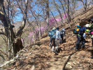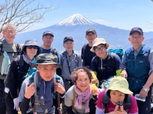 御坂峠までの登りは、足元にヒトリシズカやスミレ、木々の中に山桜やコブシが咲いていた。途中にミツバツツジの群生があり梢から富士山も見え4B(婆)と7G(爺)の撮影会になり休息。その後も綺麗な富士山が時々見えて気持の良い登山になりました。