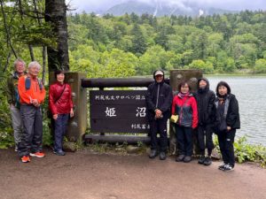 北海道は上空の寒気の影響でどこも雨雨雨。私たちに与えられたチャンスは3日。待って待って最終日、雨はあがり3時に出発。「注意してくださいね」とのお宿のあるじの助言どおり、高い木がなくなるところまで登ってくると、風速はどのくらいなのでしょうか、強風にあおられ進むことができなくなりやむなく下山、360°のパノラマはお預けとなりました。でも今回、好天には恵まれませんでしたが、皆さんのアイディアでプランが好転しました。いろいろと楽しかったです。 (記:BK)