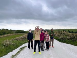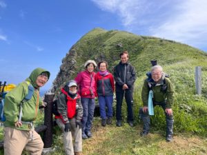 利尻空港でタラップを降り顧みすると、好天のもと、機体越しに残雪の残る美しい山容を見せてくれた利尻富士に感動し、胸が高鳴ったことが鮮明に記憶に残っている。ただ、登頂予定の翌日以降は天候に恵まれず、スケジュールを大幅に変更し日帰りでの礼文島でみた固有種のアツモリソウに感動し、日本最北端といわれる、トド島を望むスコトン岬では強風に飛ばされそうになりながら岬の先端に足跡を残し、3日目も悪天候のため利尻島を周遊し、白い恋人の丘では、若かりし頃の恋人の思い出に浸り、4日目の天候回復に期待し、北海道の海産物満載の夕食で体力を養った。午前3時前に宿を後にし、ヘッドランプをつけ登頂を開始したが、想定以上の暴風に阻まれ、森林限界に到達した時点でこれ以上進むことは危険と判断し、引き返すことになった。次年度以降改めてチャレンジすることを皆で誓った。天候には恵まれなかったが毎日雨にもマケズ、風にもマケズ、楽しく利尻・礼文・宗谷の“白い道”を楽しむことができた。Bさんスケジュール作成、宿泊施設・フェリーの予約等々お骨折りいただきありがとうございました。Tさんお誕生日おめでとう、ホテルでお祝いしたケーキは思い出に残ります。 (記:OY)