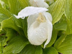 降り立った機体背後の、谷筋に残雪の利尻岳を初めて目にして、「登らずに帰れない」と思った。しかし、明日からの天気は絶望的な予報で、皆で協議し、二日後の6日に決定する。宿の変更や船の取消など、手際良いメンバーが心強い。暴風下だったがレブンアツモリソウの最盛期を堪能し、岬を登り詰め、北の海を眺めた。果てしない草原で貝殻を敷き詰めた’白い道’を通り、数えきれぬ発電風車を目にすることも出来た。もうそれで充分なのだが、最も望んでいた利尻登頂は中途断念となった。早速リベンジを誓うメンバーを頼もしく思った。 (記:KK)