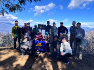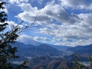 準備運動の後、山歩き開始。天気にも恵まれ、程よい傾斜の斜面を登る。冬枯れの木々の間から、都留市の街並みや中央道、リニア新幹線が垣間見える。間もなく「これより急坂、要注意」の立て看板あり。何に注意をすれば良いのだろう? 急坂は日ごろぐうたらな生活をしている我が身にはキツイ。キツイことは予想できたのに、何故来たのだろう。天狗岩近くで小休止。天狗岩に乗ると薄雲のかかった富士山が眺望できた。美しい。頂上近くの傾斜の緩やかのところに来て、我に返る。急坂を登っている間、無我の心境であったことに気付く。山に求めていたのはこれなのかもしれない。頂上で昼食の後、下山開始。かなり急な痩せ尾根なので慎重に歩を進める。風が冷たい。耳が痛い。山の厳しさの一面を知らされる。急坂が終わると、山腹をなだらかにトラバースし、札金峠を左に折れて林道に出る。下山コースには数か所熊避けの音を出すための鍋が吊り下げられていた。鍋は全て種類が異なり、音も微妙に違っていたのが興味深い。里近く、道端の一本の木の鮮やかなオレンジ色の紅葉?に疲れが癒される。LのFHさん、SLのTAさん、お世話になりました。有難うございました。(HF記)