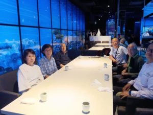 築地本願寺を出て外国人居留地通りや芥川龍之介生誕地を見ながら佃大橋を渡り月島(佃島)へ。佃煮発祥の地佃島で創業1837年の天安本店で美味しい佃煮を購入し、隅田川、晴海運河のウォーターフロントを爽やかな(?)風に吹かれながら散策し、もんじゃストリートへ。風月さんへ入りもんじゃ焼きと冷たい飲料を注文で生き返った気分。もんじゃ焼きの感想は人それぞれであるが、もんじゃストリートは50軒以上のもんじゃ焼き店があり下町の情緒と懐かしさがあり大人気スポットです。築地場外市場で何か食べながら散策したかったがもんじゃでお腹いっぱいの為見学だけに。場外は観光客でいっぱいで90%以上が外国人で賑わっている。私達は場外の「魚月(なずき)」で反省会。日本料理店で店内の壁や床がプロジェクションマッピングで海の中に居る様なお洒落なお店です。