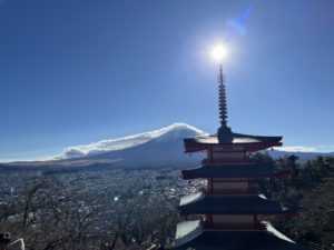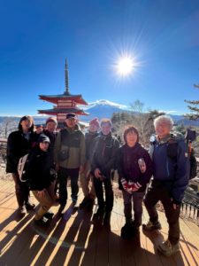 下吉田駅からタクシーに分乗、登山口の不動湯前で下車して穏やかな林道を歩き出す。所々に表示されたビューポイントから雲一つない青空と、富士山の雄姿を繰り返し目にすることができた。幾度かの休息を重ね、やや急斜面を登りきると小広い山頂についた。歩き始めて僅か2時間足らずだった。到着後リーダーさんの予想通り風が吹き始める。富士山を正面にベンチで昼食を摂り12時過ぎには下山を開始した。風は横殴りになり乾燥した土埃に難渋したが、風を避けた登山道での暖かさは格別だった。1時間ほどで下山を終えた。その後、下吉田駅の背後に立つ新倉富士浅間神社(戦没者忠霊塔)に立ち寄る。外国人に人気のあの名所である。参拝後、駆け足で駅に向かい発車直前で電車に乗るというハプニングもあった。昨秋より急激な体力低下に陥り、2ケ月ぶりの山行だったが、こんなことも思い出になるに違いない。リーダーの尾﨑さんをはじめ同行の皆さんのご配慮により無地下山、帰宅できました。深く感謝いたします。 (IK.K記)