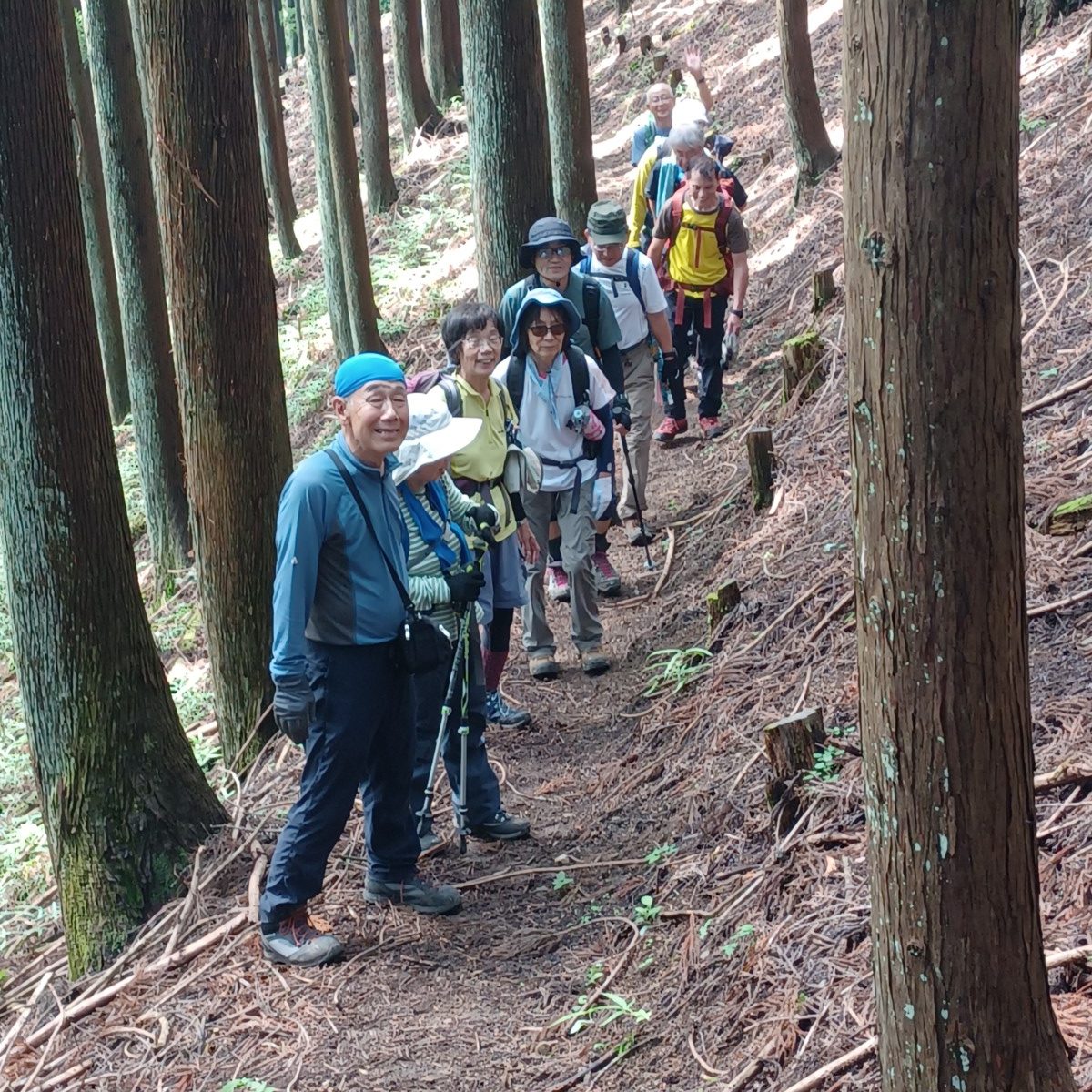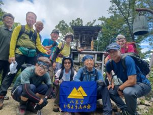 前日の夕方から大雨が降り山行を行えるか心配だったが朝は比較的天気が良くなっていた。昨日の雨のため沢筋が少し荒れていたが通行するのに支障になるほどではなかった。体操後に沢筋を登りはじめ、先ずは治山工事の堰堤が目に入って来た。巨大な堰堤でその上に土砂や流木を止める鉄骨がありこの山の急峻さの象徴の様な工作物である。登り始めから急登に続く急登で15分~20分間隔で休息をとりながら登り続けた。気温が徐々に高くなって来たが森の中なので直射日光がないだけ大助かり。暑さとの戦いは変わりない。タオルで拭いても拭いても汗が吹き出し、何時この登りが終わるのかと思いながら登り続けた。みんなの頑張りで山頂の御嶽神社に到着でき、山行安全の鐘を鳴らして記念写真を撮影した。山頂からは両神山等々の奥秩父の山々が望めるはずであったが視界が遠くまで見えず残念です。昼食後、瘦せ尾根を慎重に歩き、長い下り道に悪戦苦闘しながら常明寺(御岳山登山口)までたどり着いた。道路の反対側に秩父ジオグラビティパークがあり、キャニオンバンジーやキャニオンウォークなどのアクティビティを行っている。怖いもの見たさで話を聞いたが年齢制限がなく我々でも参加する事が可能だそうです。三峰口駅方面の白川橋まで行きキャニオスイングを見る事が出来た。若い女性二人が地上から50m落下しブランコの様に渓谷をスイングしていた。三峰口駅から電車で御花畑駅向かい西武秩父駅前の夢庵で全員無事に山行成功の反省会を行う。皆さま、大変暑い中の山行お疲れ様でした。 (F.I)
