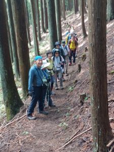 登りは覚悟していたのですが暑い中、水の流れに沿って暫く歩いた時は清涼感もありましたが、厳しかったです。何よりも道が狭く朽ちた枝や石もゴロゴロし、ロープ、鎖もありました。秩父御岳山の頂上で鐘を叩き、手を合わせた時、やっとホットできました。辛い時には、会のメンバーが声掛けや昭和歌謡での励ましのお陰で足を前に進める事ができました。 山歩きができる体力をつけていきたいと思います。 (S.E)